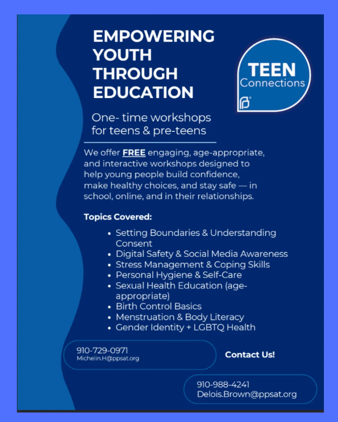 Teen Connections will be doing workshops to empower and educate teen youths for FREE to encourage them to make healthy choices and stay safe - in school, online, and in relationships.